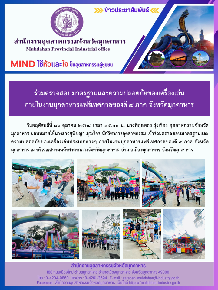 วันพฤหัสบดีที่ 16 ตุลาคม 2568 เวลา 15.00 น. นางพิกุลทอง รุ่งเรือง อุตสาหกรรมจังหวัดมุกดาหาร มอบหมายให้นางสาวสุพิชญา สุวะไกร นักวิชาการอุตสาหกรรม เข้าร่วมตรวจสอบมาตรฐานและความปลอดภัยของเครื่องเล่นประเภทต่างๆ ภายในงานมุกดาหารแฟร์เทศกาลของดี 4 ภาค จังหวัดมุกดาหาร ณ บริเวณสนามหน้าศาลากลางจังหวัดมุกดาหาร อำเภอเมืองมุกดาหาร จังหวัดมุกดาหาร