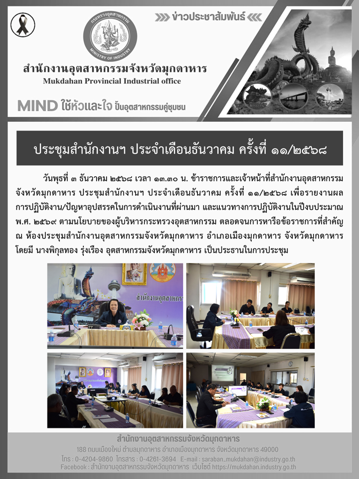 วันพุธที่ 3 ธันวาคม 2568 เวลา 13.30 น. ข้าราชการและเจ้าหน้าที่สำนักงานอุตสาหกรรมจังหวัดมุกดาหาร ประชุมสำนักงานฯ ประจำเดือนธันวาคม ครั้งที่ 11/2568 เพื่อรายงานผล การปฏิบัติงาน/ปัญหาอุปสรรคในการดำเนินงานที่ผ่านมา และแนวทางการปฏิบัติงานในปีงบประมาณ พ.ศ. 2569 ตามนโยบายของผู้บริหารกระทรวงอุตสาหกรรม ตลอดจนการหารือข้อราชการที่สำคัญ ณ ห้องประชุมสำนักงานอุตสาหกรรมจังหวัดมุกดาหาร อำเภอเมืองมุกดาหาร จังหวัดมุกดาหาร โดยมี นางพิกุลทอง รุ่งเรือง อุตสาหกรรมจังหวัดมุกดาหาร เป็นประธานในการประชุม