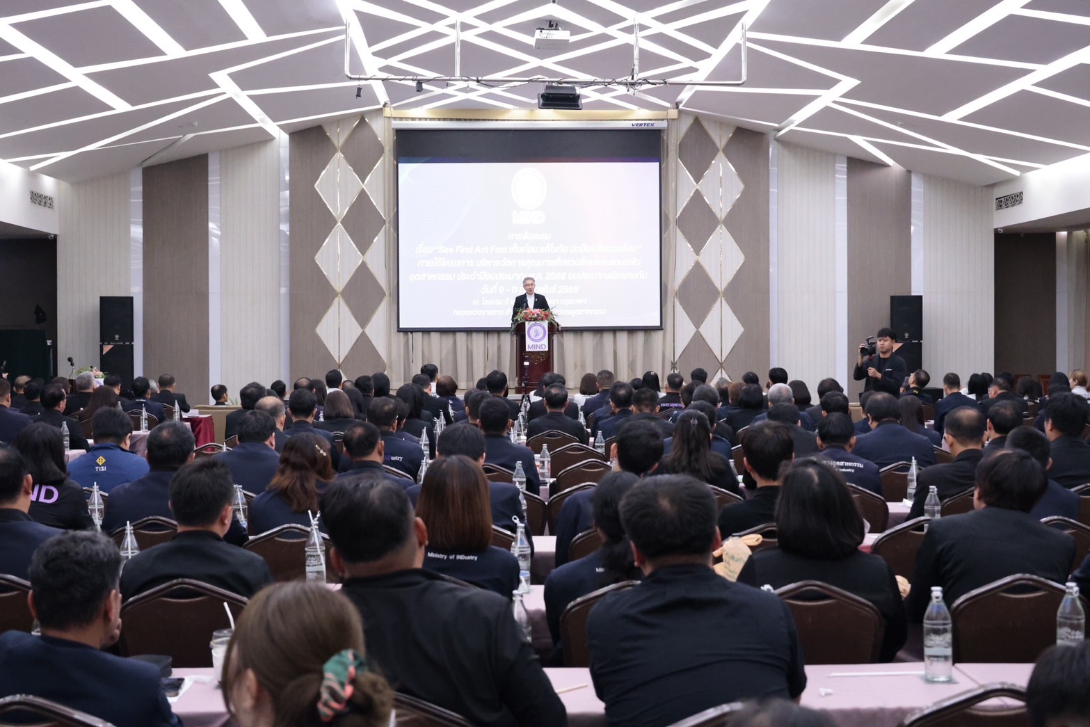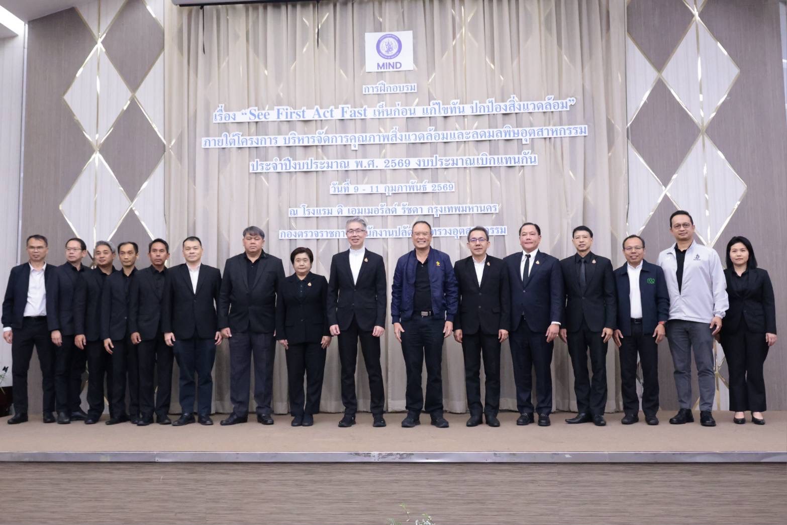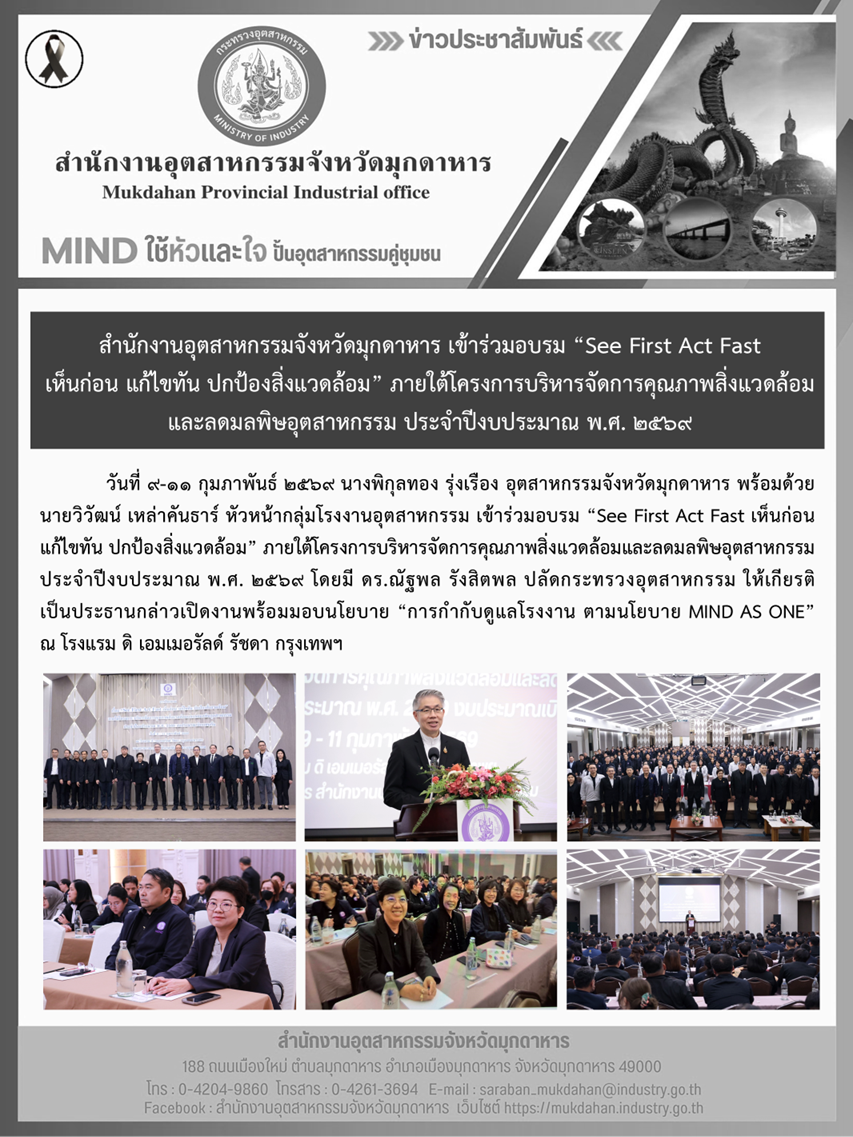 วันที่ 9-11 กุมภาพันธ์ 2569 นางพิกุลทอง รุ่งเรือง อุตสาหกรรมจังหวัดมุกดาหาร พร้อมด้วยนายวิวัฒน์ เหล่าคันธาร์ หัวหน้ากลุ่มโรงงานอุตสาหกรรม เข้าร่วมอบรม “See First Act Fast เห็นก่อน แก้ไขทัน ปกป้องสิ่งแวดล้อม” ภายใต้โครงการบริหารจัดการคุณภาพสิ่งแวดล้อมและลดมลพิษอุตสาหกรรม ประจำปีงบประมาณ พ.ศ. 2569 โดยมี ดร.ณัฐพล รังสิตพล ปลัดกระทรวงอุตสาหกรรม ให้เกียรติเป็นประธานกล่าวเปิดงานพร้อมมอบนโยบาย “การกำกับดูแลโรงงาน ตามนโยบาย MIND AS ONE” ณ โรงแรม ดิ เอมเมอรัลด์ รัชดา กรุงเทพฯ