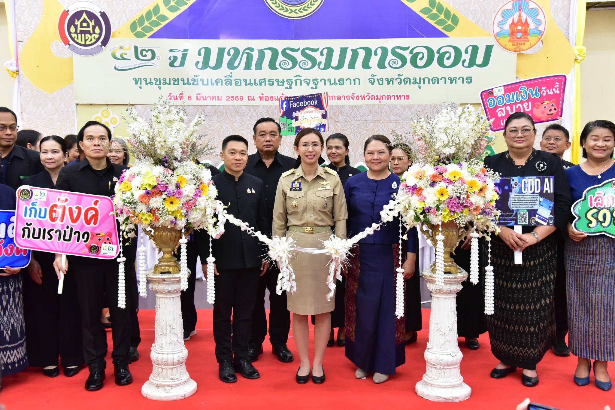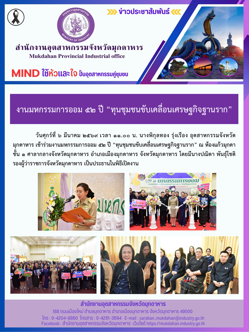 วันศุกร์ที่ 6 มีนาคม 2569 เวลา 11.00 น. นางพิกุลทอง รุ่งเรือง อุตสาหกรรมจังหวัดมุกดาหาร เข้าร่วมงานมหกรรมการออม 52 ปี “ทุนชุมชนขับเคลื่อนเศรษฐกิจฐานราก” ณ ห้องแก้วมุกดา ชั้น 1 ศาลากลางจังหวัดมุกดาหาร อำเภอเมืองมุกดาหาร จังหวัดมุกดาหาร โดยมีนางปณิดา พันธุ์โชติ รองผู้ว่าราชการจังหวัดมุกดาหาร เป็นประธานในพิธีเปิดงาน