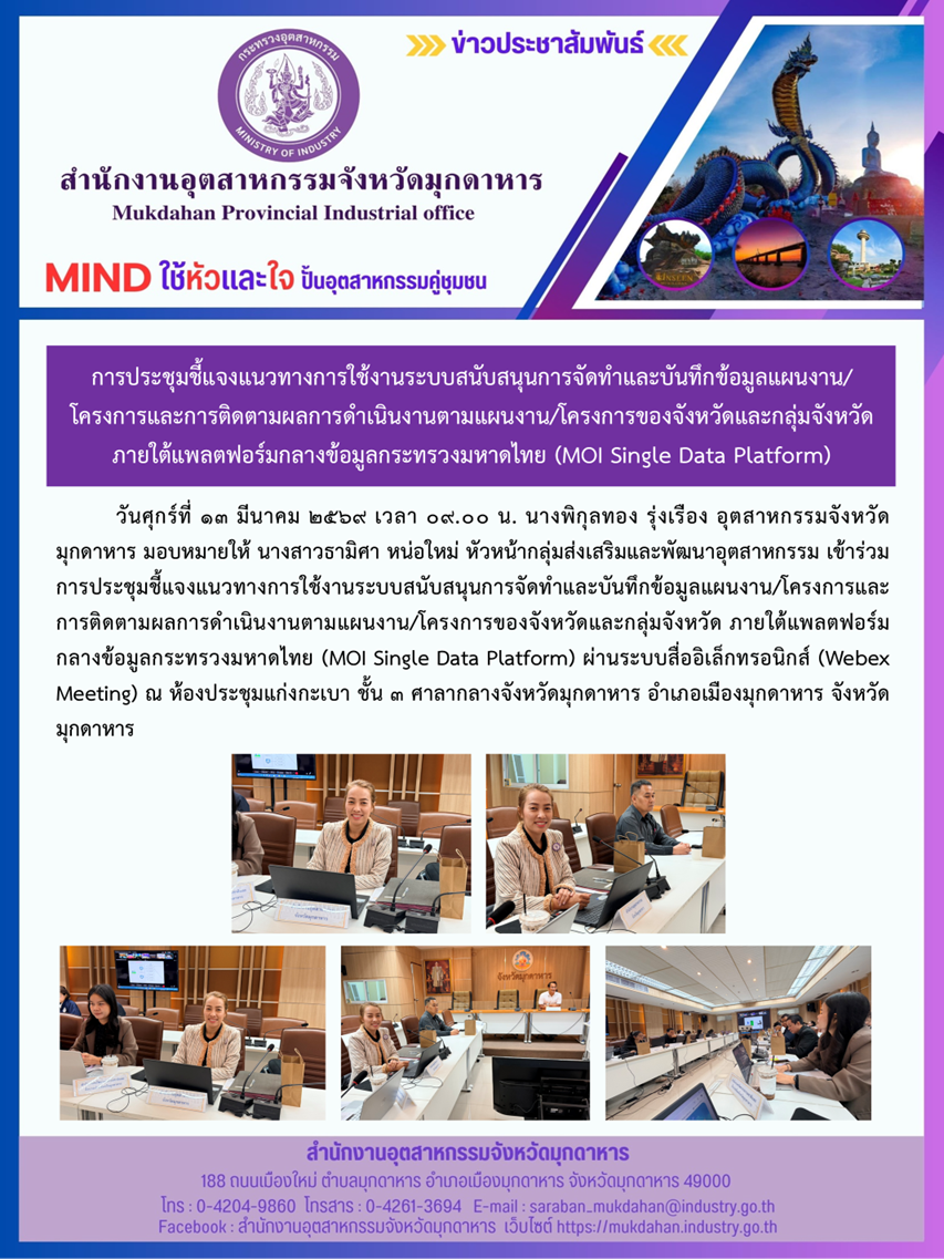 วันศุกร์ที่ 13 มีนาคม 2569 เวลา 09.00 น. นางพิกุลทอง รุ่งเรือง อุตสาหกรรมจังหวัดมุกดาหาร มอบหมายให้ นางสาวธามิศา หน่อใหม่ หัวหน้ากลุ่มส่งเสริมและพัฒนาอุตสาหกรรม เข้าร่วมการประชุมชี้แจงแนวทางการใช้งานระบบสนับสนุนการจัดทำและบันทึกข้อมูลแผนงาน/โครงการและการติดตามผลการดำเนินงานตามแผนงาน/โครงการของจังหวัดและกลุ่มจังหวัด ภายใต้แพลตฟอร์มกลางข้อมูลกระทรวงมหาดไทย (MOI Single Data Platform) ผ่านระบบสื่ออิเล็กทรอนิกส์ (Webex Meeting) ณ ห้องประชุมแก่งกะเบา ชั้น 3 ศาลากลางจังหวัดมุกดาหาร อำเภอเมืองมุกดาหาร จังหวัดมุกดาหาร