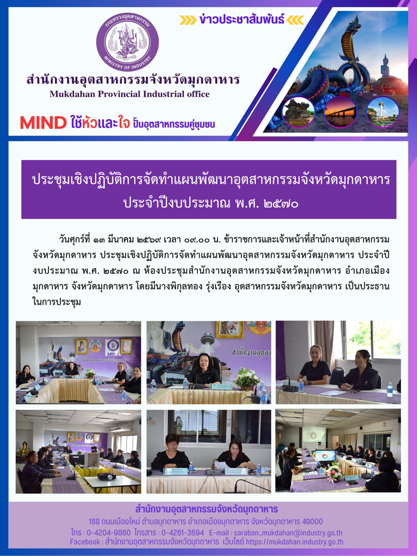 วันศุกร์ที่ 13 มีนาคม 2569 เวลา 09.00 น. ข้าราชการและเจ้าหน้าที่สำนักงานอุตสาหกรรมจังหวัดมุกดาหาร ประชุมเชิงปฏิบัติการจัดทำแผนพัฒนาอุตสาหกรรมจังหวัดมุกดาหาร ประจำปีงบประมาณ พ.ศ. 2570 ณ ห้องประชุมสำนักงานอุตสาหกรรมจังหวัดมุกดาหาร อำเภอเมืองมุกดาหาร จังหวัดมุกดาหาร โดยมีนางพิกุลทอง รุ่งเรือง อุตสาหกรรมจังหวัดมุกดาหาร เป็นประธานในการประชุม