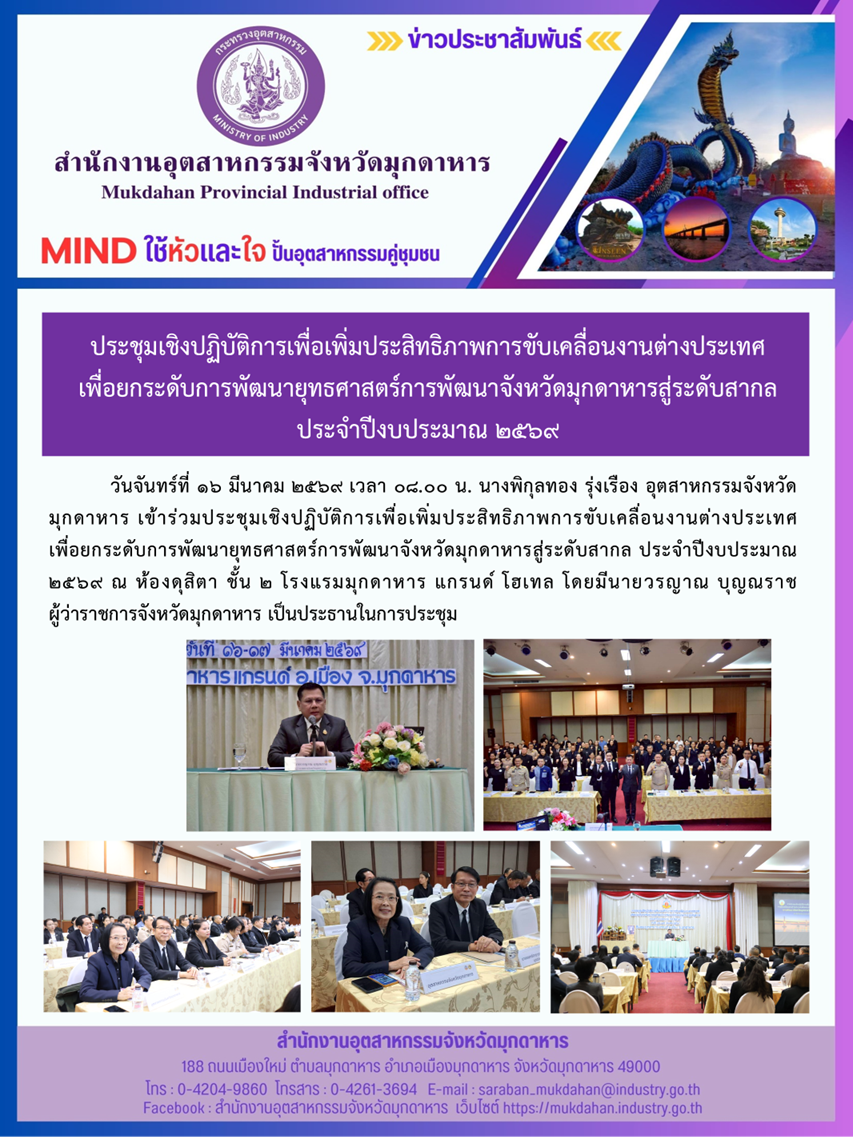 วันจันทร์ที่ 16 มีนาคม 2569 เวลา 08.00 น. นางพิกุลทอง รุ่งเรือง อุตสาหกรรมจังหวัดมุกดาหาร เข้าร่วมประชุมเชิงปฏิบัติการเพื่อเพิ่มประสิทธิภาพการขับเคลื่อนงานต่างประเทศ เพื่อยกระดับการพัฒนายุทธศาสตร์การพัฒนาจังหวัดมุกดาหารสู่ระดับสากล ประจำปีงบประมาณ 2569 ณ ห้องดุสิตา ชั้น 2 โรงแรมมุกดาหาร แกรนด์ โฮเทล โดยมีนายวรญาณ บุญณราช ผู้ว่าราชการจังหวัดมุกดาหาร เป็นประธานในการประชุม