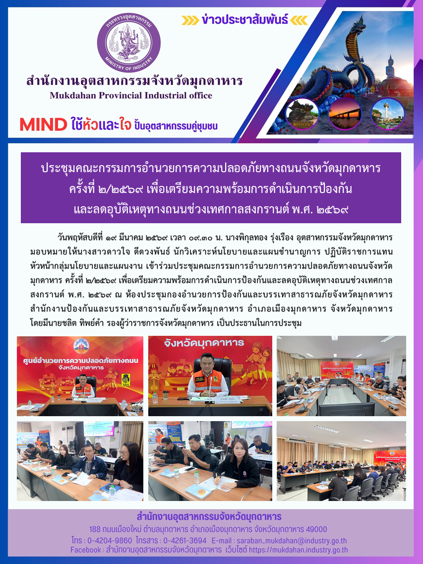 วันพฤหัสบดีที่ 19 มีนาคม 2569 เวลา 09.30 น. นางพิกุลทอง รุ่งเรือง อุตสาหกรรมจังหวัดมุกดาหาร มอบหมายให้นางสาวดาวใจ ดีดวงพันธ์ นักวิเคราะห์นโยบายและแผนชำนาญการ ปฏิบัติราชการแทน หัวหน้ากลุ่มนโยบายและแผนงาน เข้าร่วมประชุมคณะกรรมการอำนวยการความปลอดภัยทางถนนจังหวัดมุกดาหาร ครั้งที่ 2/2569 เพื่อเตรียมความพร้อมการดำเนินการป้องกันและลดอุบัติเหตุทางถนนช่วงเทศกาลสงกรานต์ พ.ศ. 2569 ณ ห้องประชุมกองอำนวยการป้องกันและบรรเทาสาธารณภัยจังหวัดมุกดาหาร สำนักงานป้องกันและบรรเทาสาธารณภัยจังหวัดมุกดาหาร อำเภอเมืองมุกดาหาร จังหวัดมุกดาหาร โดยมีนายชลิต ทิพย์คำ รองผู้ว่าราชการจังหวัดมุกดาหาร เป็นประธานในการประชุม