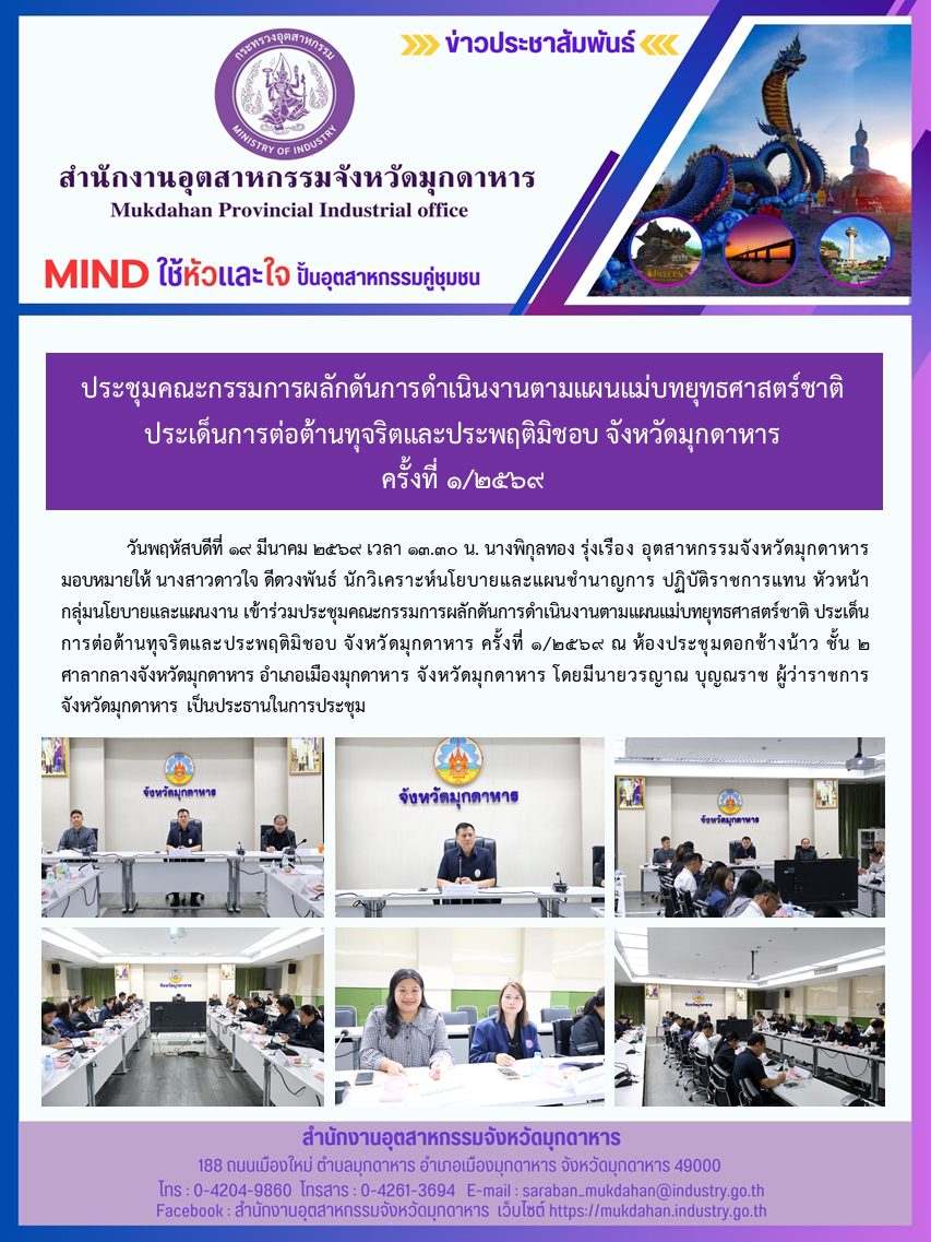 วันพฤหัสบดีที่ 19 มีนาคม 2569 เวลา 13.30 น. นางพิกุลทอง รุ่งเรือง อุตสาหกรรมจังหวัดมุกดาหาร มอบหมายให้ นางสาวดาวใจ ดีดวงพันธ์ นักวิเคราะห์นโยบายและแผนชำนาญการ ปฏิบัติราชการแทน หัวหน้ากลุ่มนโยบายและแผนงาน เข้าร่วมประชุมคณะกรรมการผลักดันการดำเนินงานตามแผนแม่บทยุทธศาสตร์ชาติ ประเด็นการต่อต้านทุจริตและประพฤติมิชอบ จังหวัดมุกดาหาร ครั้งที่ 1/2569 ณ ห้องประชุมดอกช้างน้าว ชั้น 2 ศาลากลางจังหวัดมุกดาหาร อำเภอเมืองมุกดาหาร จังหวัดมุกดาหาร โดยมีนายวรญาณ บุญณราช ผู้ว่าราชการจังหวัดมุกดาหาร เป็นประธานในการประชุม