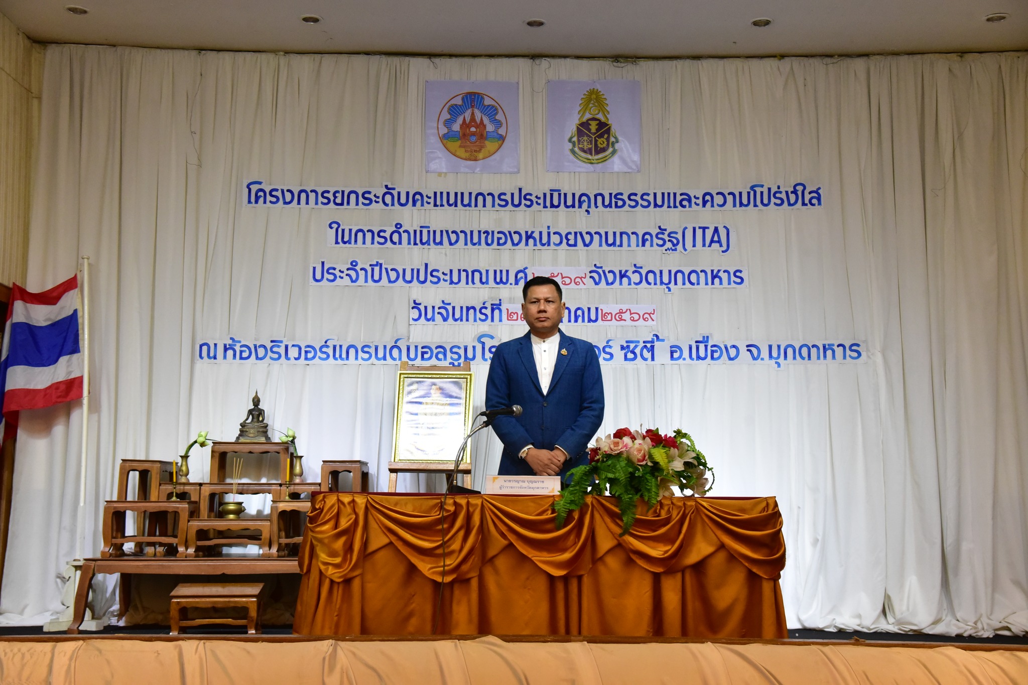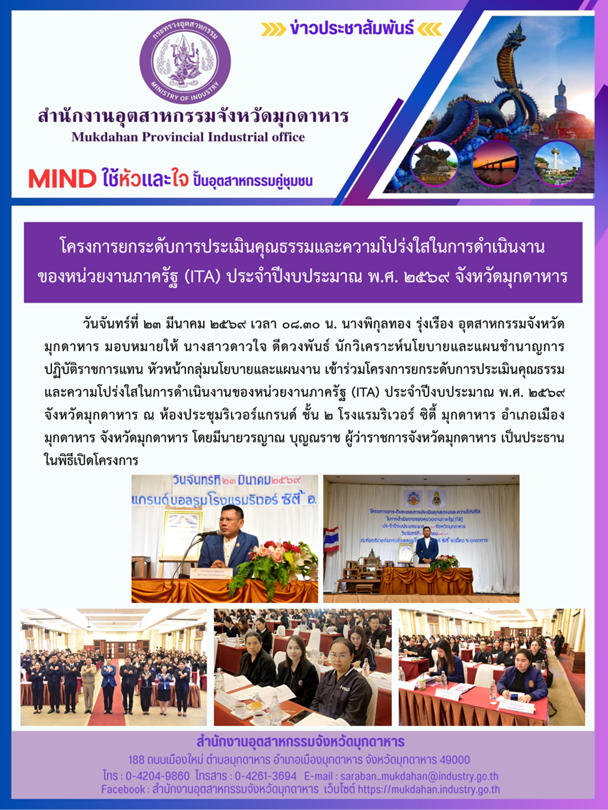 วันจันทร์ที่ 23 มีนาคม 2569 เวลา 08.30 น. นางพิกุลทอง รุ่งเรือง อุตสาหกรรมจังหวัดมุกดาหาร มอบหมายให้ นางสาวดาวใจ ดีดวงพันธ์ นักวิเคราะห์นโยบายและแผนชำนาญการ ปฏิบัติราชการแทน หัวหน้ากลุ่มนโยบายและแผนงาน เข้าร่วมโครงการยกระดับการประเมินคุณธรรมและความโปร่งใสในการดำเนินงานของหน่วยงานภาครัฐ (ITA) ประจำปีงบประมาณ พ.ศ. 2569 จังหวัดมุกดาหาร ณ ห้องประชุมริเวอร์แกรนด์ ชั้น 2 โรงแรมริเวอร์ ซิตี้ มุกดาหาร อำเภอเมืองมุกดาหาร จังหวัดมุกดาหาร โดยมีนายวรญาณ บุญณราช ผู้ว่าราชการจังหวัดมุกดาหาร เป็นประธานในพิธีเปิดโครงการ