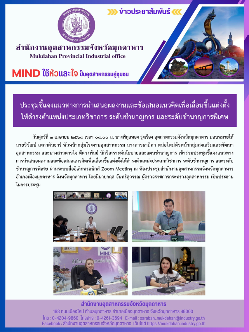 วันศุกร์ที่ 3 เมษายน 2569 เวลา 09.00 น. นางพิกุลทอง รุ่งเรือง อุตสาหกรรมจังหวัดมุกดาหาร มอบหมายให้นายวิวัฒน์ เหล่าคันธาร์ หัวหน้ากลุ่มโรงงานอุตสาหกรรม นางสาวธามิศา หน่อใหม่หัวหน้ากลุ่มส่งเสริมและพัฒนาอุตสาหกรรม และนางสาวดาวใจ ดีดวงพันธ์ นักวิเคราะห์นโยบายและแผนชำนาญการ เข้าร่วมประชุมชี้แจงแนวทางการนำเสนอผลงานและข้อเสนอแนวคิดเพื่อเลื่อนขึ้นแต่งตั้งให้ดำรงตำแหน่งประเภทวิชาการ ระดับชำนาญการ และระดับชำนาญการพิเศษ ผ่านระบบสื่ออิเล็กทรอนิกส์ Zoom Meeting ณ ห้องประชุมสำนักงานอุตสาหกรรมจังหวัดมุกดาหาร อำเภอเมืองมุกดาหาร จังหวัดมุกดาหาร โดยมีนายกฤศ จันทร์สุวรรณ ผู้ตรวจราชการกระทรวงอุตสาหกรรม เป็นประธานในการประชุม