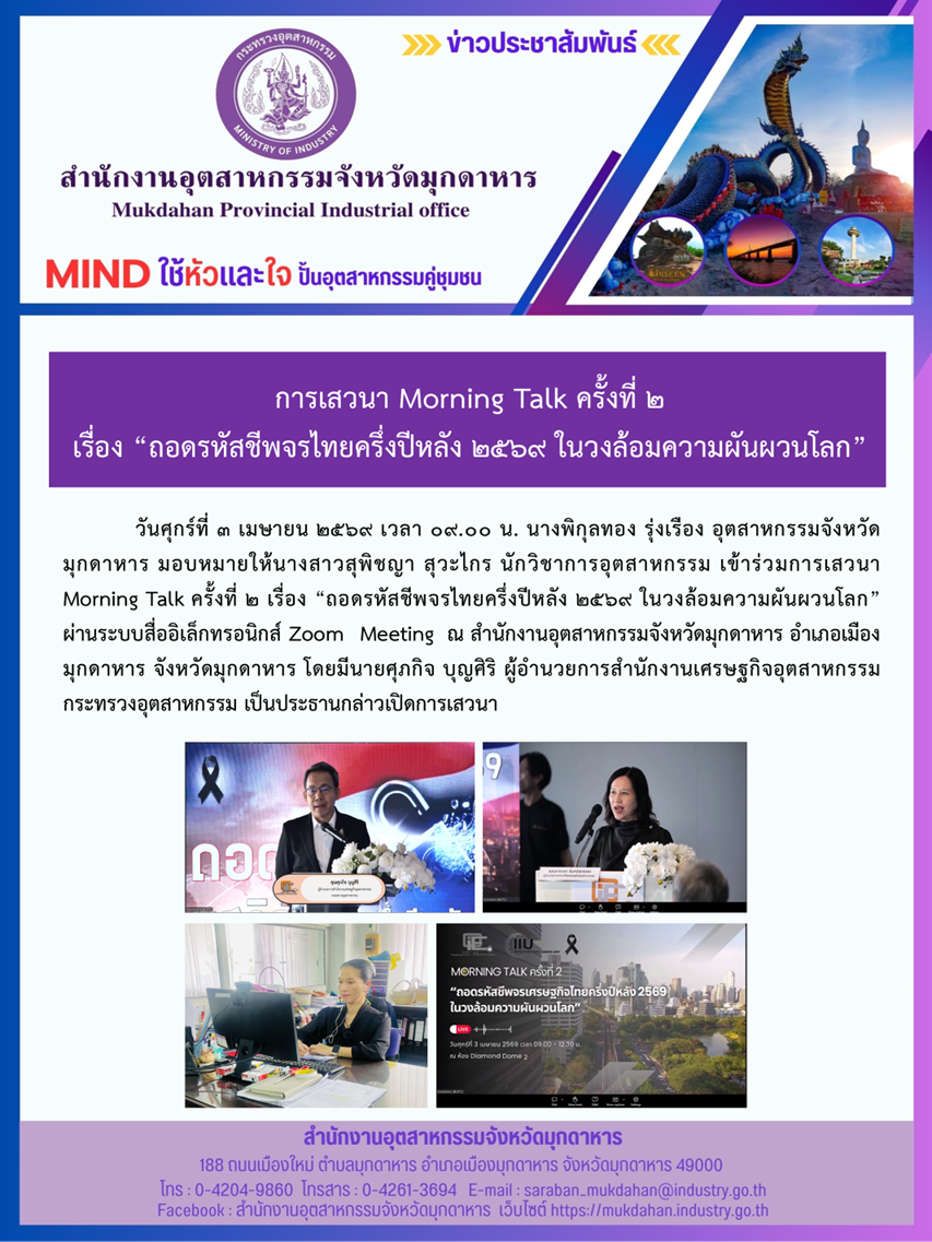 วันศุกร์ที่ 3 เมษายน 2569 เวลา 09.00 น. นางพิกุลทอง รุ่งเรือง อุตสาหกรรมจังหวัดมุกดาหาร มอบหมายให้นางสาวสุพิชญา สุวะไกร นักวิชาการอุตสาหกรรม เข้าร่วมการเสวนา Morning Talk ครั้งที่ 2 เรื่อง “ถอดรหัสชีพจรไทยครึ่งปีหลัง 2569 ในวงล้อมความผันผวนโลก” ผ่านระบบสื่ออิเล็กทรอนิกส์ Zoom Meeting ณ สำนักงานอุตสาหกรรมจังหวัดมุกดาหาร อำเภอเมืองมุกดาหาร จังหวัดมุกดาหาร โดยมีนายศุภกิจ บุญศิริ ผู้อำนวยการสำนักงานเศรษฐกิจอุตสาหกรรม กระทรวงอุตสาหกรรม เป็นประธานกล่าวเปิดการเสวนา