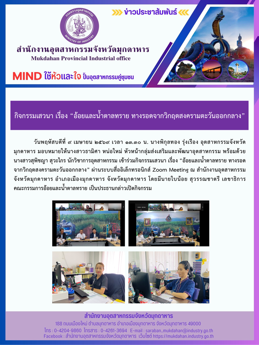 วันพฤหัสบดีที่ 9 เมษายน 2569 เวลา 13.30 น. นางพิกุลทอง รุ่งเรือง อุตสาหกรรมจังหวัดมุกดาหาร มอบหมายให้นางสาวธามิศา หน่อใหม่ หัวหน้ากลุ่มส่งเสริมและพัฒนาอุตสาหกรรม พร้อมด้วยนางสาวสุพิชญา สุวะไกร นักวิชาการอุตสาหกรรม เข้าร่วมกิจกรรมเสวนา เรื่อง “อ้อยและน้ำตาลทราย ทางรอดจากวิกฤตสงครามตะวันออกกลาง” ผ่านระบบสื่ออิเล็กทรอนิกส์ Zoom Meeting ณ สำนักงานอุตสาหกรรมจังหวัดมุกดาหาร อำเภอเมืองมุกดาหาร จังหวัดมุกดาหาร โดยมีนายใบน้อย สุวรรณชาตรี เลขาธิการคณะกรรมการอ้อยและน้ำตาลทราย เป็นประธานกล่าวเปิดกิจกรรม