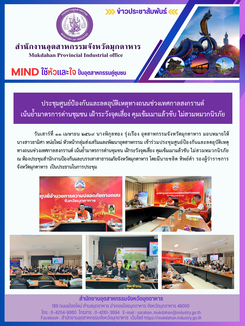 วันเสาร์ที่ 11 เมษายน 2569 นางพิกุลทอง รุ่งเรือง อุตสาหกรรมจังหวัดมุกดาหาร มอบหมายให้ นางสาวธามิศา หน่อใหม่ หัวหน้ากลุ่มส่งเสริมและพัฒนาอุตสาหกรรม เข้าร่วมประชุมศูนย์ป้องกันและลดอุบัติเหตุทางถนนช่วงเทศกาลสงกรานต์ เน้นย้ำมาตรการด่านชุมชน เฝ้าระวังจุดเสี่ยง คุมเข้มเมาแล้วขับ ไม่สวมหมวกนิรภัย ณ ห้องประชุมสำนักงานป้องกันและบรรเทาสาธารณภัยจังหวัดมุกดาหาร โดยมีนายชลิต ทิพย์คำ รองผู้ว่าราชการจังหวัดมุกดาหาร เป็นประธานในการประชุม