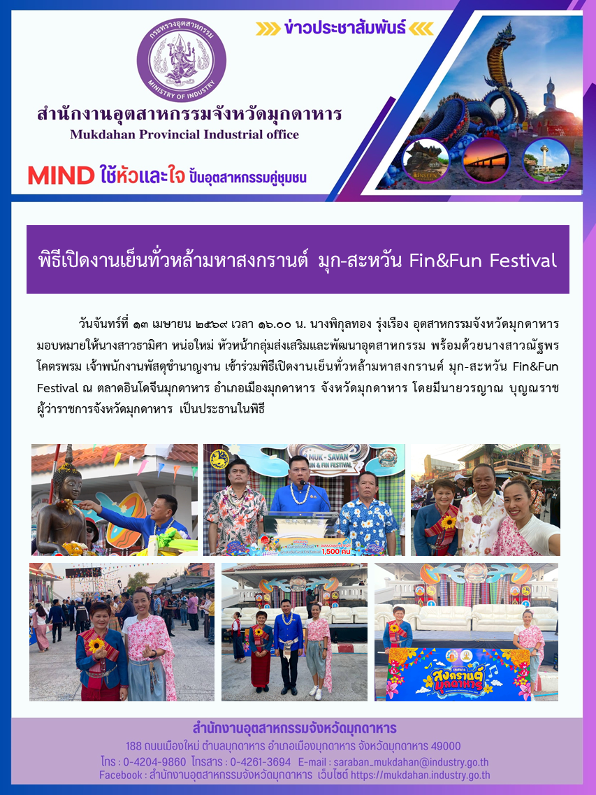 วันจันทร์ที่ 13 เมษายน 2569 เวลา 16.00 น. นางพิกุลทอง รุ่งเรือง อุตสาหกรรมจังหวัดมุกดาหาร มอบหมายให้นางสาวธามิศา หน่อใหม่ หัวหน้ากลุ่มส่งเสริมและพัฒนาอุตสาหกรรม พร้อมด้วยนางสาวณัฐพร โคตรพรม เจ้าพนักงานพัสดุชำนาญงาน เข้าร่วมพิธีเปิดงานเย็นทั่วหล้ามหาสงกรานต์ มุก-สะหวัน Fin&Fun Festival ณ ตลาดอินโดจีนมุกดาหาร อำเภอเมืองมุกดาหาร จังหวัดมุกดาหาร โดยมีนายวรญาณ บุญณราช ผู้ว่าราชการจังหวัดมุกดาหาร เป็นประธานในพิธี