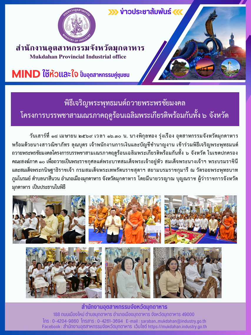 วันเสาร์ที่ 18 เมษายน 2569 เวลา 16.30 น. นางพิกุลทอง รุ่งเรือง อุตสาหกรรมจังหวัดมุกดาหาร พร้อมด้วยนางสาวณิชาภัทร ลุณบุตร เจ้าพนักงานการเงินและบัญชีชำนาญงาน เข้าร่วมพิธีเจริญพระพุทธมนต์ถวายพระพรชัยมงคลโครงการบรรพชาสามเณรภาคฤดูร้อนเฉลิมพระเกียรติพร้อมกันทั้ง 6 จังหวัด ในเขตปกครองคณะสงฆ์ภาค 10 เพื่อถวายเป็นพระราชกุศลแด่พระบาทสมเด็จพระเจ้าอยู่หัว สมเด็จพระนางเจ้าฯ พระบรมราชินี และสมเด็จพระกนิษฐาธิราชเจ้า กรมสมเด็จพระเทพรัตนราชสุดาฯ สยามบรมราชกุมารี ณ วัดรอยพระพุทธบาทภูมโนรมย์ ตำบลนาสีนวน อำเภอเมืองมุกดาหาร จังหวัดมุกดาหาร โดยมีนายวรญาณ บุญณราช ผู้ว่าราชการจังหวัดมุกดาหาร เป็นประธานในพิธี