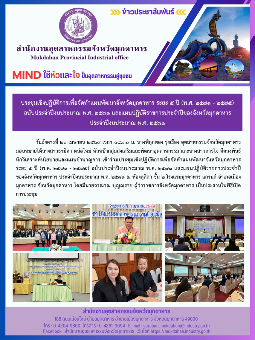 วันอังคารที่ 21 เมษายน 2569 เวลา 08.30 น. นางพิกุลทอง รุ่งเรือง อุตสาหกรรมจังหวัดมุกดาหาร มอบหมายให้นางสาวธามิศา หน่อใหม่ หัวหน้ากลุ่มส่งเสริมและพัฒนาอุตสาหกรรม และนางสาวดาวใจ ดีดวงพันธ์ นักวิเคราะห์นโยบายและแผนชำนาญการ เข้าร่วมประชุมเชิงปฏิบัติการเพื่อจัดทำแผนพัฒนาจังหวัดมุกดาหาร ระยะ 5 ปี (พ.ศ. 2571 - 2575) ฉบับประจำปีงบประมาณ พ.ศ. 2571 และแผนปฏิบัติราชการประจำปีของจังหวัดมุกดาหาร ประจำปีงบประมาณ พ.ศ. 2571 ณ ห้องดุสิตา ชั้น 2 โรงแรมมุกดาหาร แกรนด์ อำเภอเมืองมุกดาหาร จังหวัดมุกดาหาร โดยมีนายวรณาณ บุญณราช ผู้ว่าราชการจังหวัดมุกดาหาร เป็นประธานในพิธีเปิดการประชุม