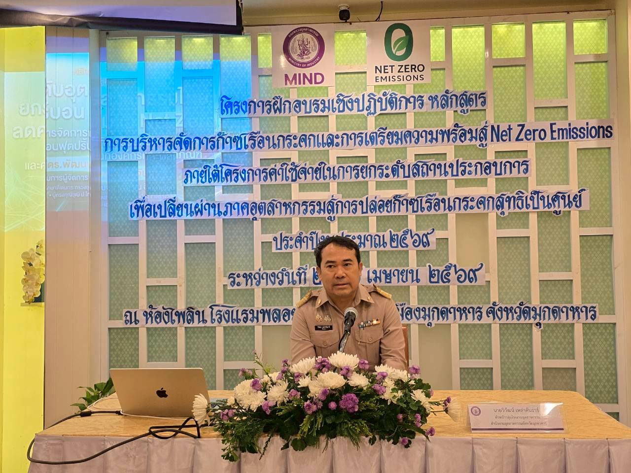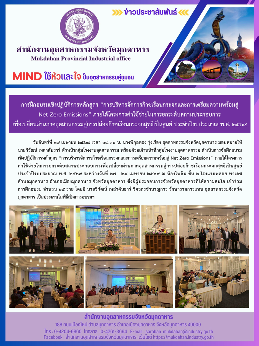 วันจันทร์ที่ 27 เมษายน 2569 เวลา 08.30 น. นางพิกุลทอง รุ่งเรือง อุตสาหกรรมจังหวัดมุกดาหาร มอบหมายให้ นายวิวัฒน์ เหล่าคันธาร์ หัวหน้ากลุ่มโรงงานอุตสาหกรรม พร้อมด้วยเจ้าหน้าที่กลุ่มโรงงานอุตสาหกรรม ดำเนินการจัดฝึกอบรมเชิงปฏิบัติการหลักสูตร “การบริหารจัดการก๊าซเรือนกระจกและการเตรียมความพร้อมสู่ Net Zero Emissions” ภายใต้โครงการค่าใช้จ่ายในการยกระดับสถานประกอบการเพื่อเปลี่ยนผ่านภาคอุตสาหกรรมสู่การปล่อยก๊าซเรือนกระจกสุทธิเป็นศูนย์ ประจำปีงบประมาณ พ.ศ. 2569 ระหว่างวันที่ 27 - 28 เมษายน 2569 ณ ห้องไพลิน ชั้น 2 โรงแรมพลอย พาเลซ ตำบลมุกดาหาร อำเภอเมืองมุกดาหาร จังหวัดมุกดาหาร ซึ่งมีผู้ประกอบการจังหวัดมุกดาหารที่ให้ความสนใจ เข้าร่วมการฝึกอบรม จำนวน 25 ราย โดยมี นายวิวัฒน์ เหล่าคันธาร์ วิศวกรชำนาญการ รักษาราชการแทน อุตสาหกรรมจังหวัดมุกดาหาร เป็นประธานในพิธีเปิดการอบรมฯ