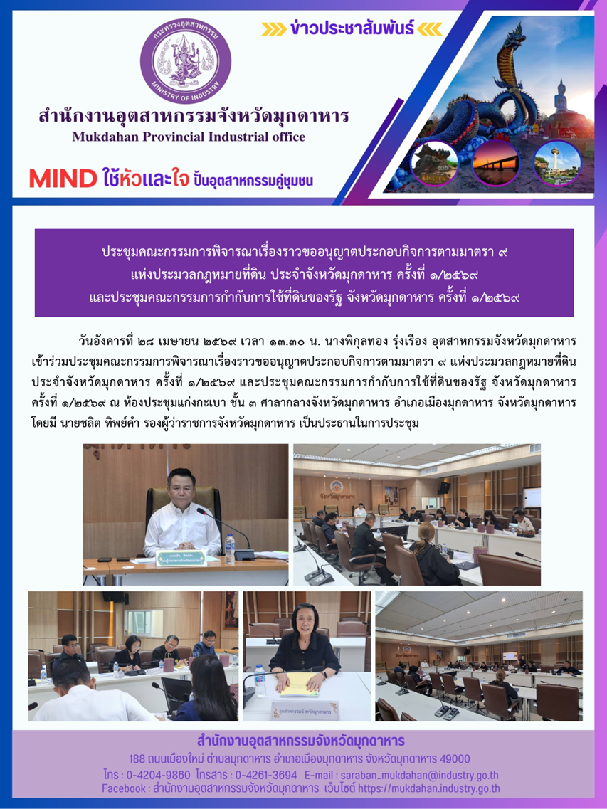 วันอังคารที่ 28 เมษายน 2569 เวลา 13.30 น. นางพิกุลทอง รุ่งเรือง อุตสาหกรรมจังหวัดมุกดาหาร เข้าร่วมประชุมคณะกรรมการพิจารณาเรื่องราวขออนุญาตประกอบกิจการตามมาตรา 9 แห่งประมวลกฎหมายที่ดิน ประจำจังหวัดมุกดาหาร ครั้งที่ 1/2569 และประชุมคณะกรรมการกำกับการใช้ที่ดินของรัฐ จังหวัดมุกดาหาร ครั้งที่ 1/2569 ณ ห้องประชุมแก่งกะเบา ชั้น 3 ศาลากลางจังหวัดมุกดาหาร อำเภอเมืองมุกดาหาร จังหวัดมุกดาหาร โดยมี นายชลิต ทิพย์คำ รองผู้ว่าราชการจังหวัดมุกดาหาร เป็นประธานในการประชุม