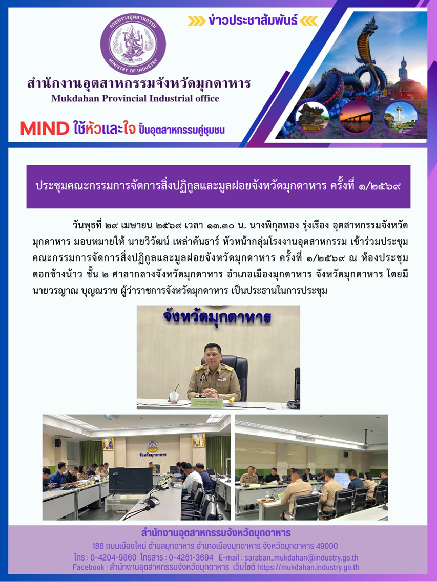 วันพุธที่ 29 เมษายน 2569 เวลา 13.30 น. นางพิกุลทอง รุ่งเรือง อุตสาหกรรมจังหวัดมุกดาหาร มอบหมายให้ นายวิวัฒน์ เหล่าคันธาร์ หัวหน้ากลุ่มโรงงานอุตสาหกรรม เข้าร่วมประชุมคณะกรรมการจัดการสิ่งปฏิกูลและมูลฝอยจังหวัดมุกดาหาร ครั้งที่ 1/2569 ณ ห้องประชุมดอกช้างน้าว ชั้น 2 ศาลากลางจังหวัดมุกดาหาร อำเภอเมืองมุกดาหาร จังหวัดมุกดาหาร โดยมี นายวรญาณ บุญณราช ผู้ว่าราชการจังหวัดมุกดาหาร เป็นประธานในการประชุม